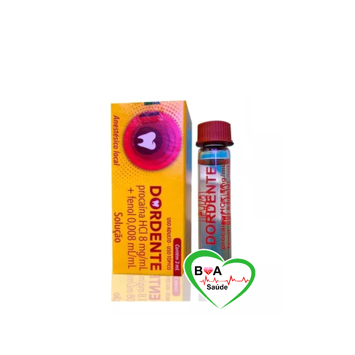 DORDENTE, Alivio para dor dente tradicional boa saude. Anestésico local em flaconetes de 3ml, o DORDENTE é uma solução com duas substâncias ativas, Procaína e Fenol, com essência de cravo, mentol, sacarina sódica e álcool etílico.